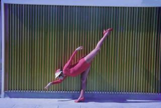 Annette Kellerman's love of colour is obvious from her pink outfit in this beautifully executed promotional photograph. The vertical lines in the backdrop add to the drama of Kellerman's pose.