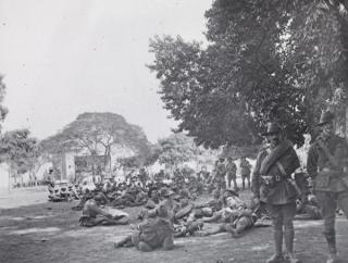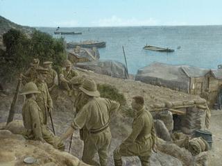 This hand-coloured glass slide shows British soldiers near a dugout at ANZAC Cove. The scene appears calm, with the men in small, groups close to sandbagged dugouts and tents. The barges remind us that supplies were always a concern, as they had to be shipped in. Despite the superficial calmness of a blue and grey tinted sea and sky, the Allied forces had to struggle with a rough terrain, establishing shelter and supply lines on rugged cliffs and narrow unprotected beaches.