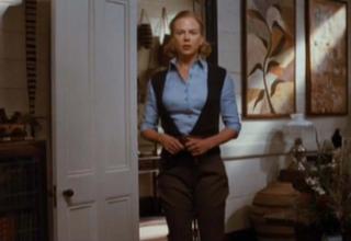 Catherine Martin received an Academy Award nomination for Australia's costume design. Lady Sarah's open collar and more casual attire in this scene show just how more comfortable she is now in Australia. Lady Sarah's more relaxed appearance is also at odds with Fletcher's suit (black, in case you had any doubt he was up to no good). Wearing a suit to call on her gives Fletcher the appearance of courtesy, but this is belied by his proprietorial and threatening manner.