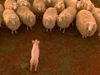 Apart from the humour with which it was made, and the novelty of the talking animals rendered convincing for practically the first time on live-action film, Babe was a worldwide success partly because it’s a film about survival. It begins in the pig equivalent of a death camp; Babe’s mother and father are led away to be butchered, then his brothers and sisters. He is saved only by the luck of the draw. It’s a chilling opening for a film aimed primarily at children, but that may be part of why people responded to it: the film doesn’t lie about the cruel ways of the world. The book, by English children’s author Dick King-Smith, doesn’t open in the same industrialised farming scene, although it’s very frank about what pigs are for. Mrs Hoggett sees Babe only in terms of bacon and pork chops. In the film, Babe is confronted with the truth early in his new life on the farm, when the duck Ferdinand explains some unpleasant facts – humans eat animals. Babe refuses to believe it at first, until he sees what happens to another duck on Christmas eve. Ferdy’s erratic behaviour – trying to turn himself into a rooster – is a response to the brutal fact that he has no other function than to be eaten. Babe’s desire to become a sheep-pig follows the same logic. Although he never expresses it, he’s trying to make himself indispensable to Farmer Hoggett, in order to survive.
