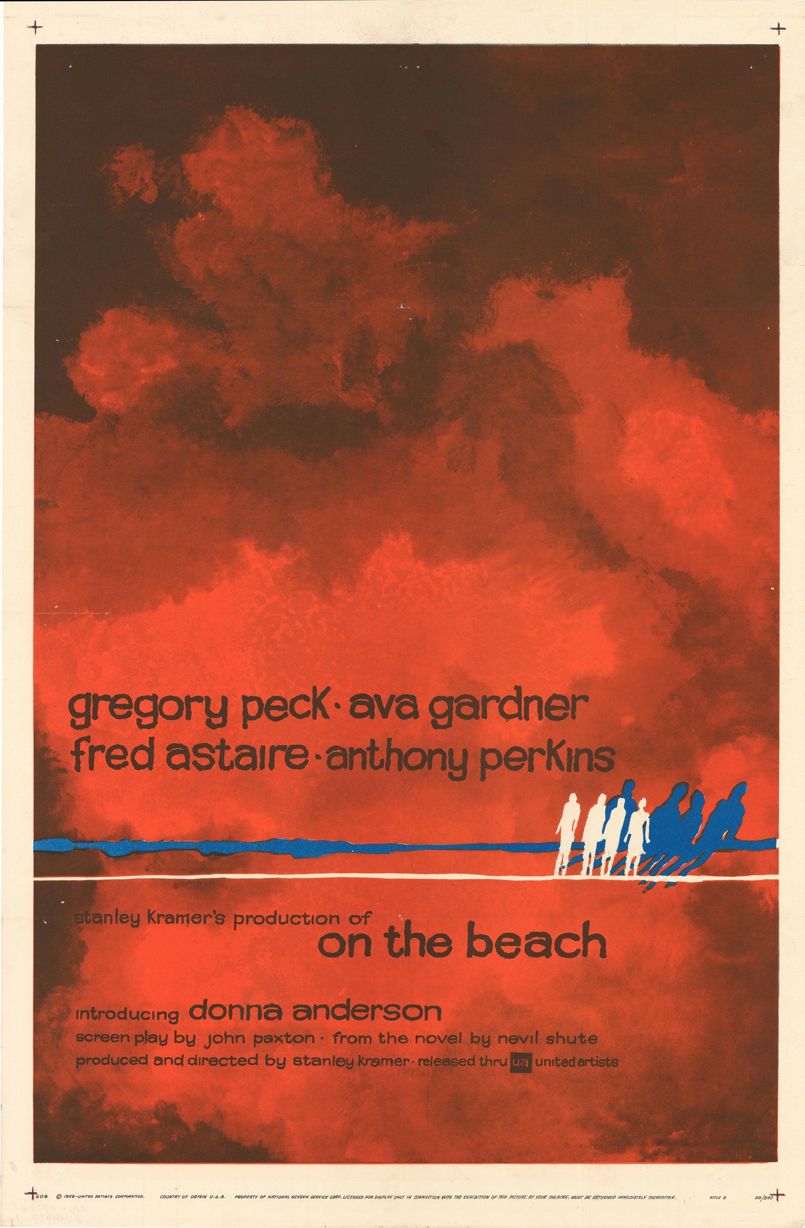 One-sheet poster for US release of On The Beach. The menacing, red toxic cloud dwarfs all other design elements and is successful in visually representing the central plot of the film, which depicts the aftermath of nuclear war.