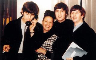 Photograph taken in 1964 when Binny Lum interviewed John Lennon, George Harrison and Ringo Starr from The Beatles in London. Photo by Geoff Charter.