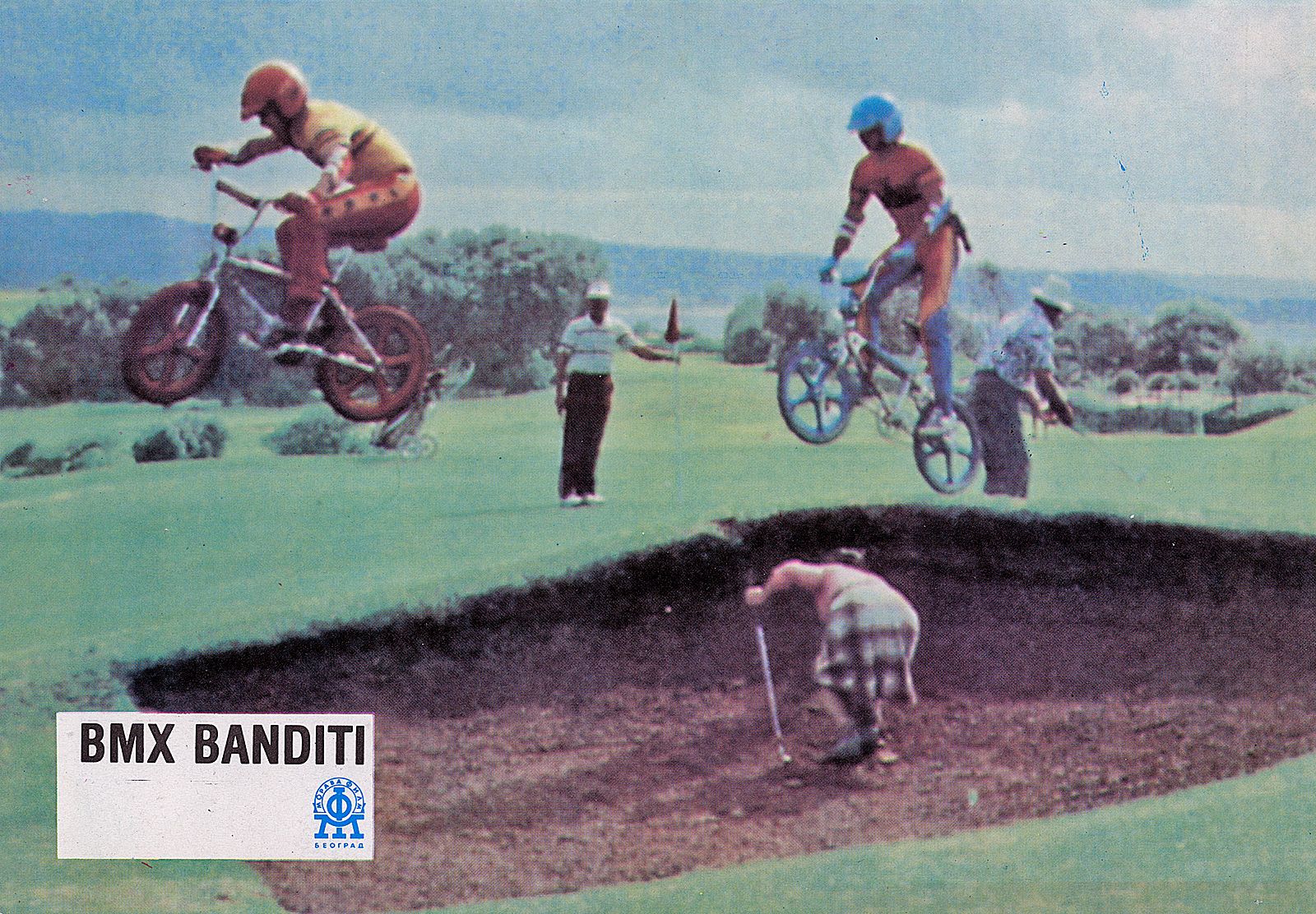 This card captures an amusing moment when our BMX heroes leap over a bunker on a golf course.