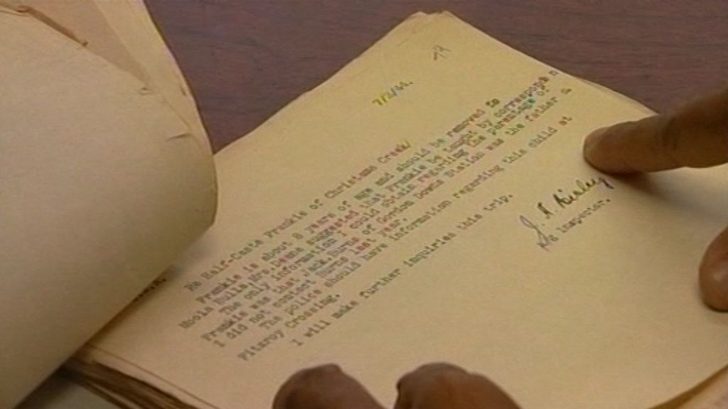 Evelyn Grove (Graylands Hospital nurse), Frank Byrne and Justin Howard (Stolen Generations senior case worker) walk the corridors of Claremont Hospital. Evelyn talks about Maudie Yooringun, Frank’s mother, and how she loved going to the children’s ward to help look after the kids. Evelyn recalls when one day she asked Maudie if she had any family, Maudie became visibly upset. Evelyn says getting out of Claremont was an unlikely prospect for the inmates. Black-and-white reconstruction depicts a young Maudie, with Frank’s voice-over saying that once Maudie was taken to Claremont, she would never ever get out again. Maudie remained incarcerated in Claremont Hospital for the insane for 18 years. Pam Mikus, Community Liaison for Graylands, shows Frank and Evelyn hospital archives, some of the contents depicting Maudie. Summary by Romaine Moreton.