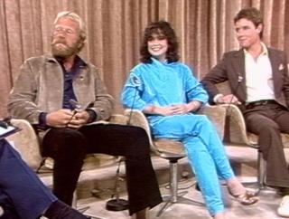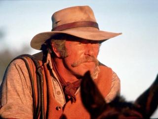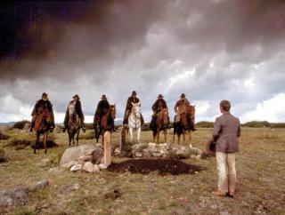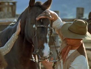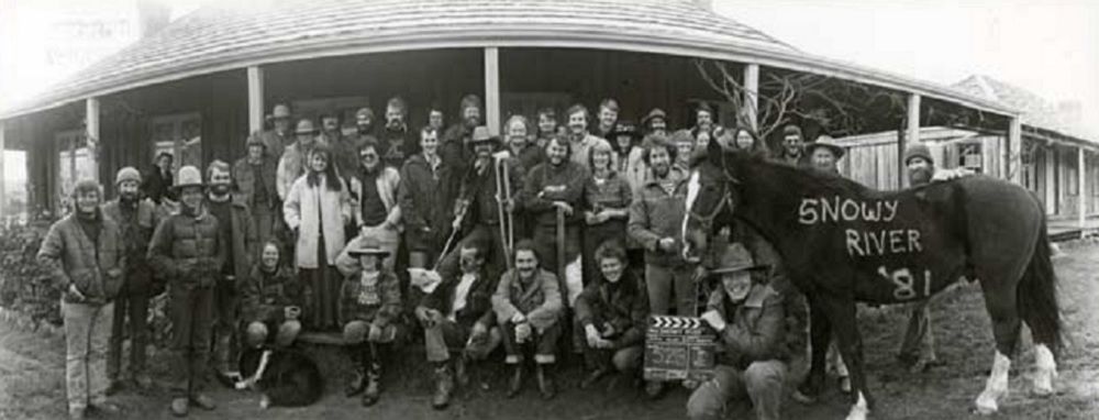 Panoramic photo of the cast and crew from the film, including a horse with 'Snowy River 1981' painted on its side.