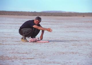 Cinematographer Christopher Doyle on a salt pan during the shooting of Rabbit-Proof Fence.