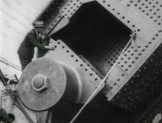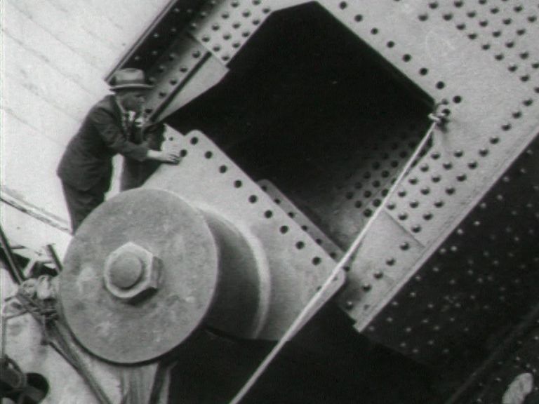 A worker puts in rivets while another tightens nuts with a huge spanner. A ferry passes underneath the bridge and an intertitle explains this is 'The ill-fated Tahiti passing under for the last time'. Workmen climb into an open-air lift.