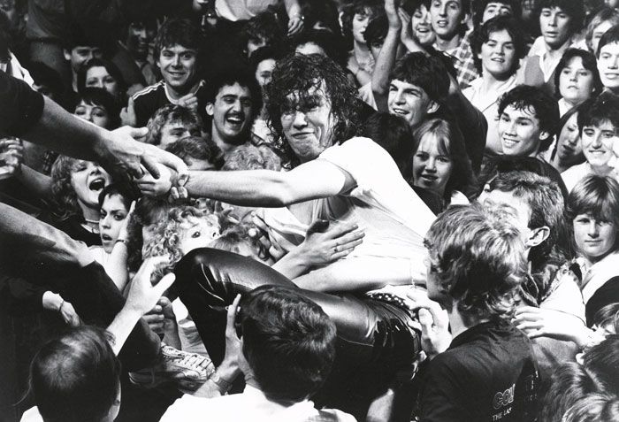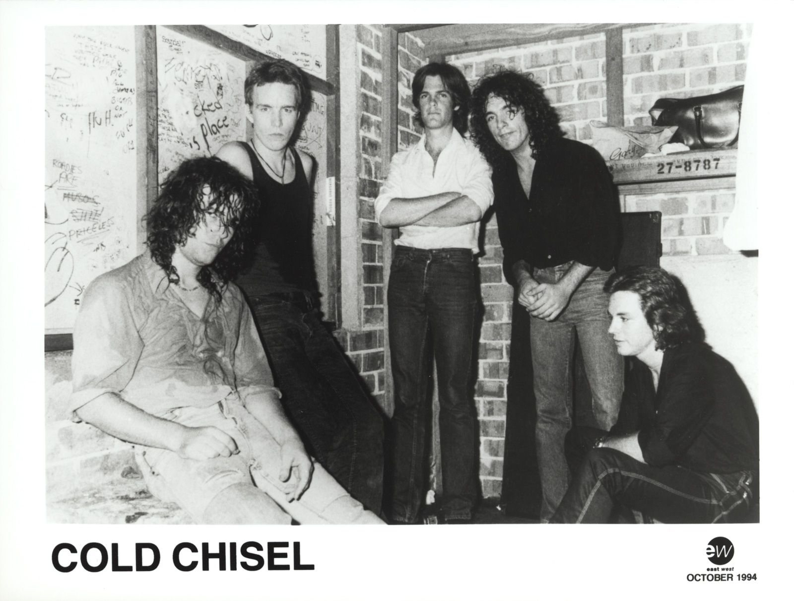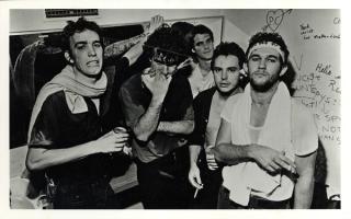 Publicity shot of the five band members of Cold Chisel in a graffitied room drinking beer and smoking cigarettes.