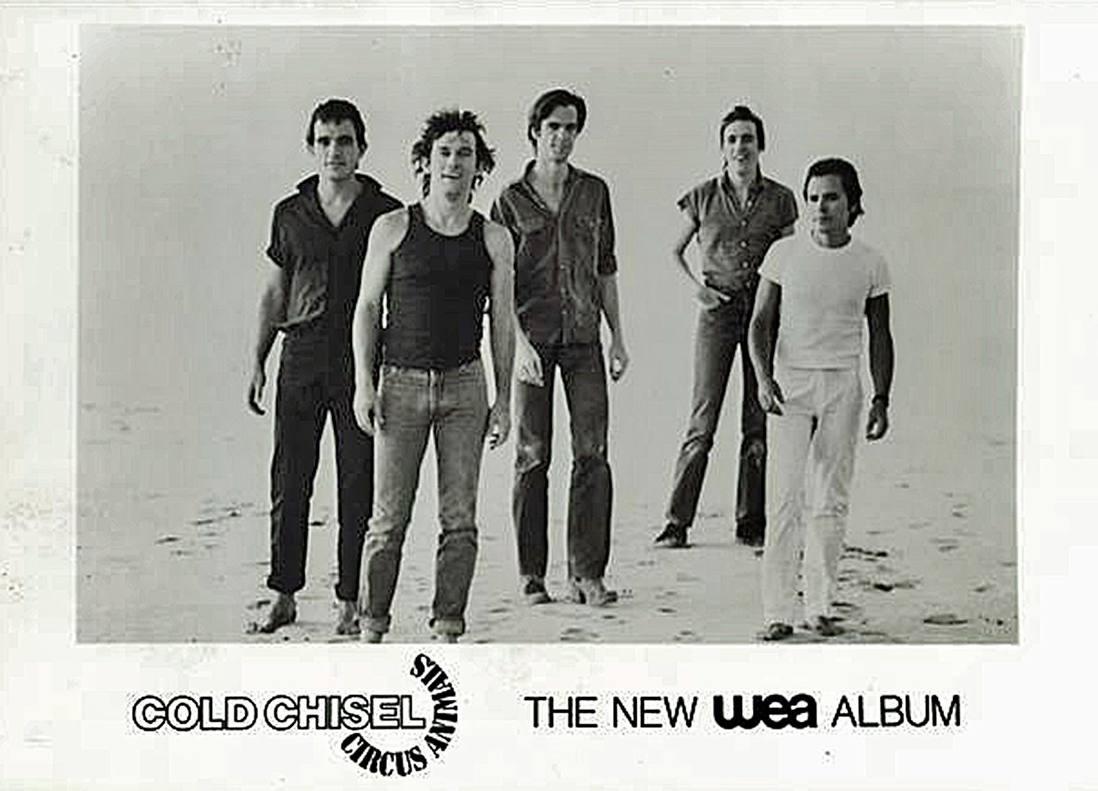 Cold Chisel publicity photo to promote the release of the album Circus Animals in 1982. The photo shoot for the album took place on the salt pans of Lake Eyre.