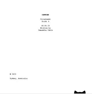 A 'scriptment' – like this one by Samantha Cable for video game Copycat – is a hybrid of a script (or screenplay) and a story treatment. It combines narrative detail with select dialogue and key scenes, showcasing the video game and its direction in a more simplified form than the master screenplay. This is the cover sheet for Draft 5, a reminder that most games evolve slowly over many drafts.