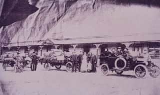 The Corrick’s touring convoy pose outside the Jubilee Hotel, Lottah, Tasmania, 1914