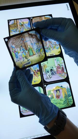 Curator examining glass slides of Peter Pan