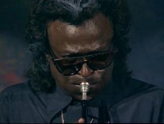 Film music is usually composed after shooting has been done; in this case, it had to be recorded beforehand, so that performances could be filmed to match the tracks. One of the initial difficulties, encountered on the first day of shooting with Miles Davis (the concert on the runway) was that he tended to play a different interpretation of the music with each take, rather than sticking to the notes already recorded. ‘We rehearsed and rehearsed and time and again Miles would find himself playing an improvised counter-melody against the original trumpet line. It was beautiful but unusable. Those first few hours with Miles and the whole attendant circus were the most despairing hours of filming I’ve ever done. Then gradually, Miles learnt this new discipline, this new way of playing, and slowly the weight started to lift’.