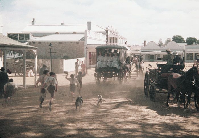 The main street of Woodend, Victoria as recreated in Picnic at Hanging Rock. Mr Hussey drives the schoolgirls to Hanging Rock.