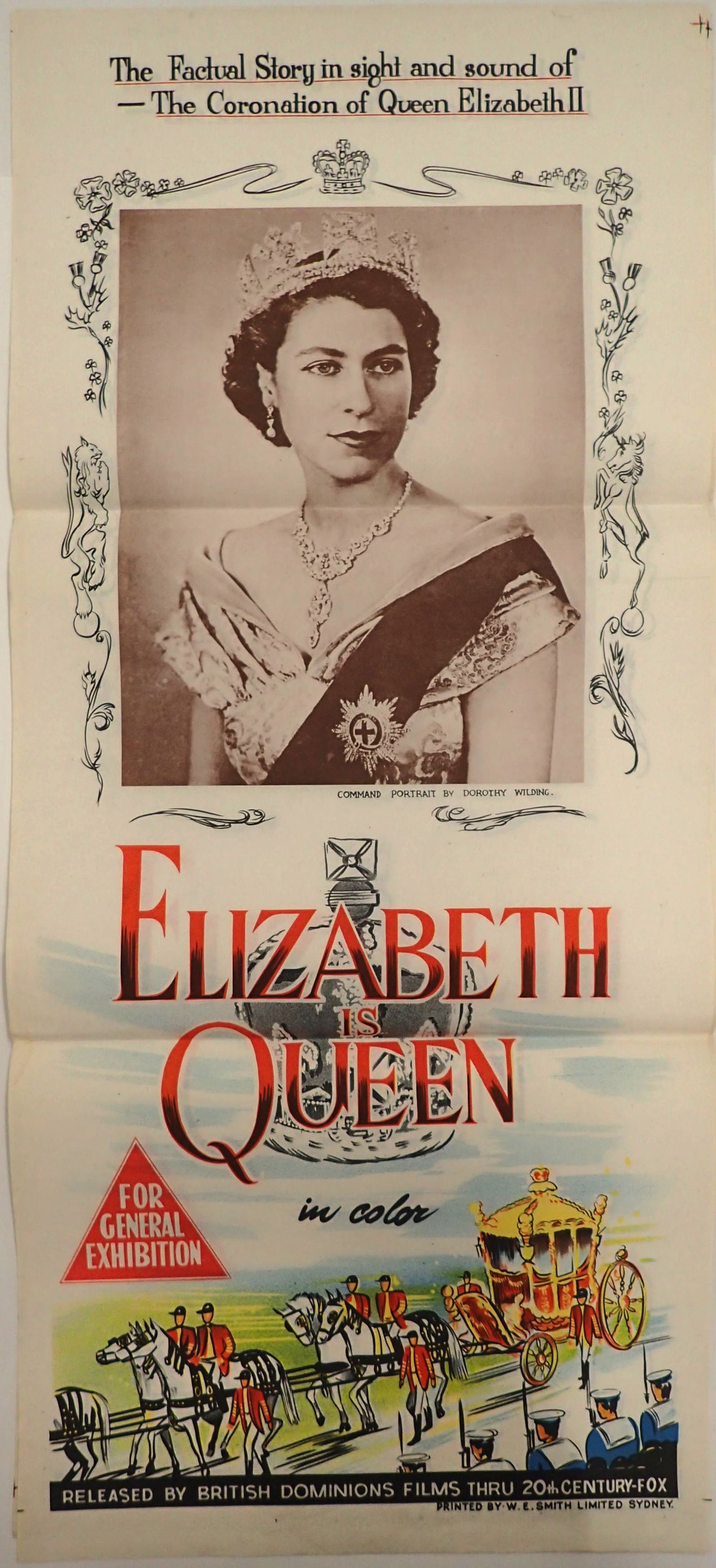 Daybill poster for Australian release of the film Elizabeth is Queen (British Pathe, 1953), documenting the coronation of Her Majesty Queen Elizabeth II on 2 June 1953.