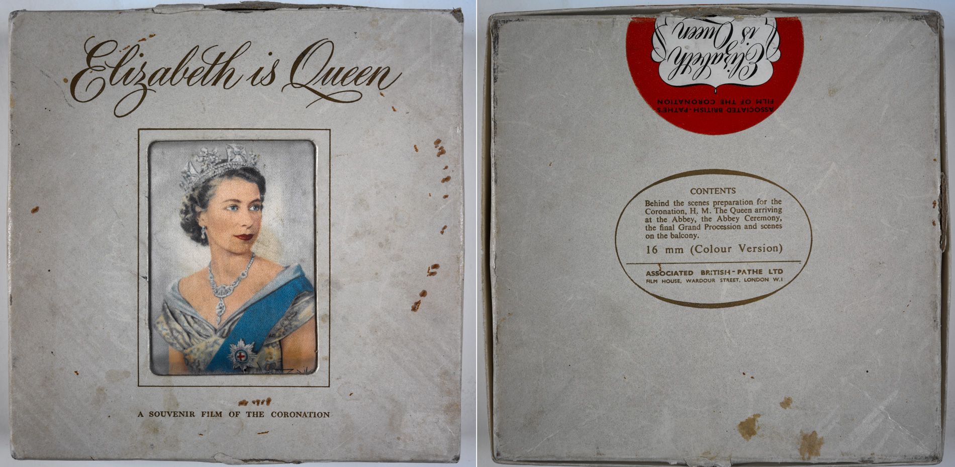 Souvenir box for 16mm copy of Elizabeth is Queen with a silk image of the Queen.