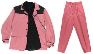 This costume, made for the crucial scene in which Elvis makes his debut on the Hayride stage in Louisiana, features a a pink, light woollen suit jacket with black accents on the shoulders, black piping on the jacket edge, cuffs and collar, and black buttons on the front of the jacket and cuff of each sleeve.