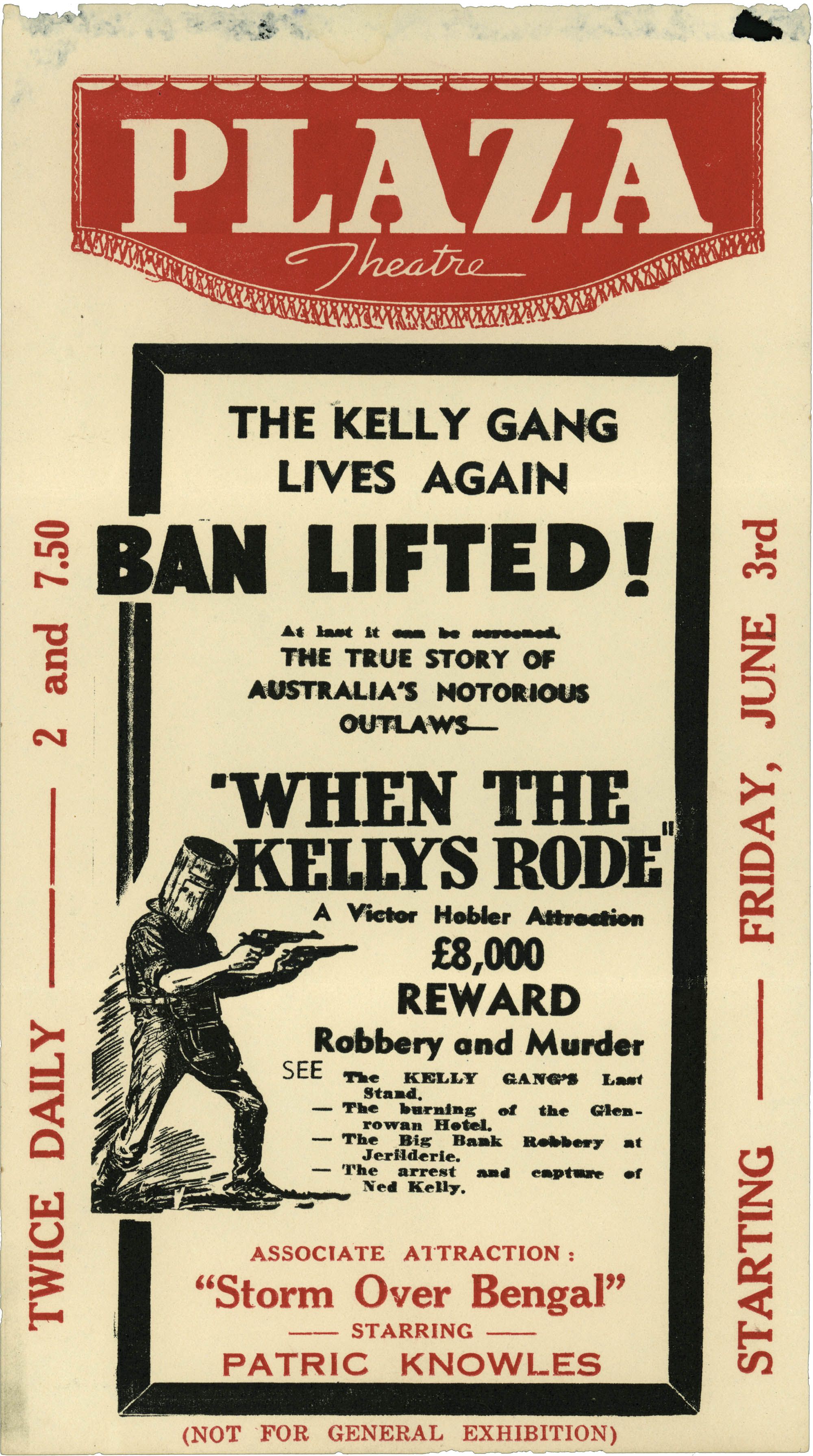 This flyer's optimism is misleading since When the Kellys Rode had to be re-cut to meet censorship requirements. However, it provides valuable information about the film's release and how theatres could use controversy over the ban to boost their marketing efforts.