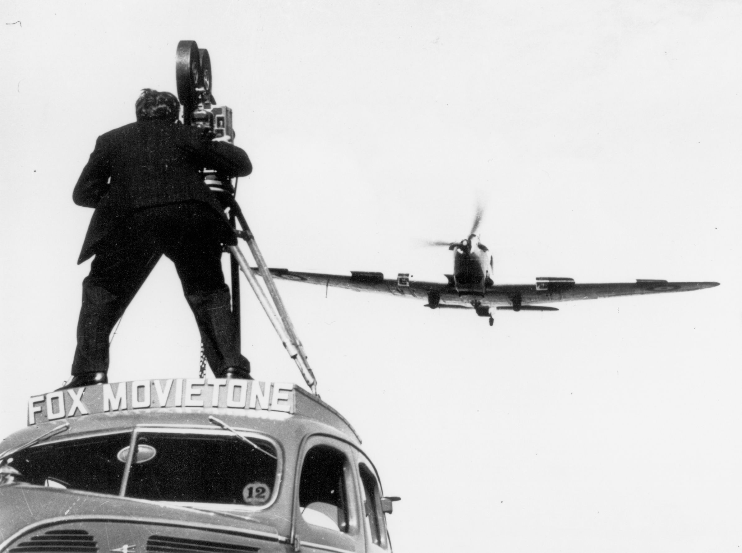 A Fox Movietone cameraman stands on top of a car, filming a fighter aircraft as it flies overhead.