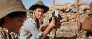 An extremely vivid and sardonic view of the trenches, the result of extensive research, gives a superb sense of what trench life on Gallipoli was like. The scene illustrates well the use of humour as a means of coping, and the close proximity of the trench lines. There had been a series of films about Gallipoli in the early part of the century - but nothing had dared to show the realities of trench life with such frank detail.