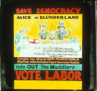 One of the most unusual political glass cinema slides in the collection is this vibrant work used by the Labor Party for the 1940 federal election. Alice in Blunderland was a 1907 novel by John Kendrick Bangs, which parodied Lewis Carroll’s Alice’s Adventures in Wonderland and Through the Looking-Glass. Alice in Blunderland was critical of taxation, corruption and corporate greed, key ideas portrayed in this slide by the Labor Party. In this wartime advertisement, then Prime Minister Robert Menzies is depicted as the Mad Hatter wearing a hat with UAP (United Australia Party), Country Party leader Archie Cameron as the Dormouse and Billy Hughes peeping from behind the table, all looking over manufacturing plans for Bren guns and Beaufort bombers