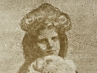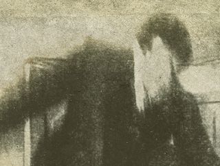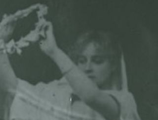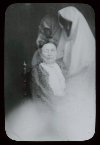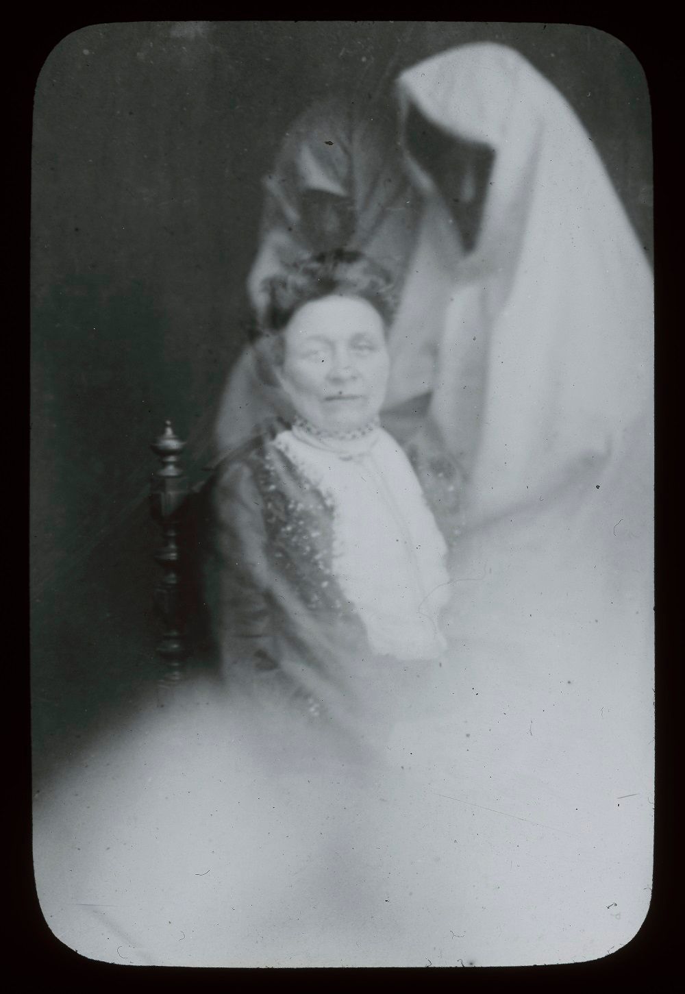 In many of these glass slides the photographer has left a convenient space in which the spirit can be superimposed. Less common are images where the spirit, or in this case, spirits, are crowded into the image and partially cut across the photo of the living subject.
