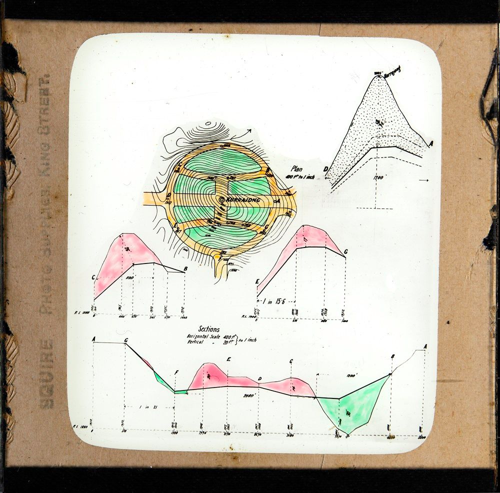 This slide shows a plan and four section drawings of the roadworks planned for the inner circuit of Kurrajong Hill, as proposed by Walter Burley Griffin.