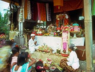 John Darling standing next to camera on tripod during filming of ‘Lempad of Bali’.