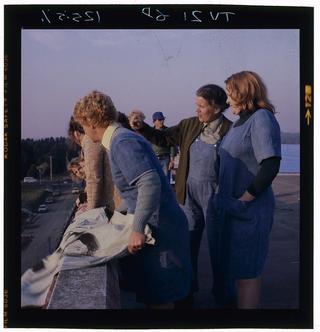 Rooftop protest rehearsal with Betty Bobbitt (Judy Bryant) and Val Lehman (Bea Smith). The scene is featured in episode 121.