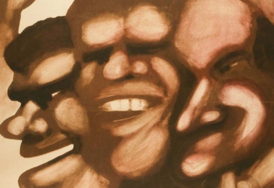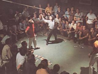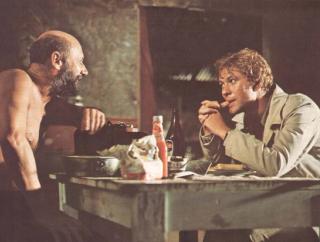 An Australian lobby card to promote the release of Wake in Fright in 1971 featuring a photo of Doc Tydon (Donald Pleasence) at the two-up game.