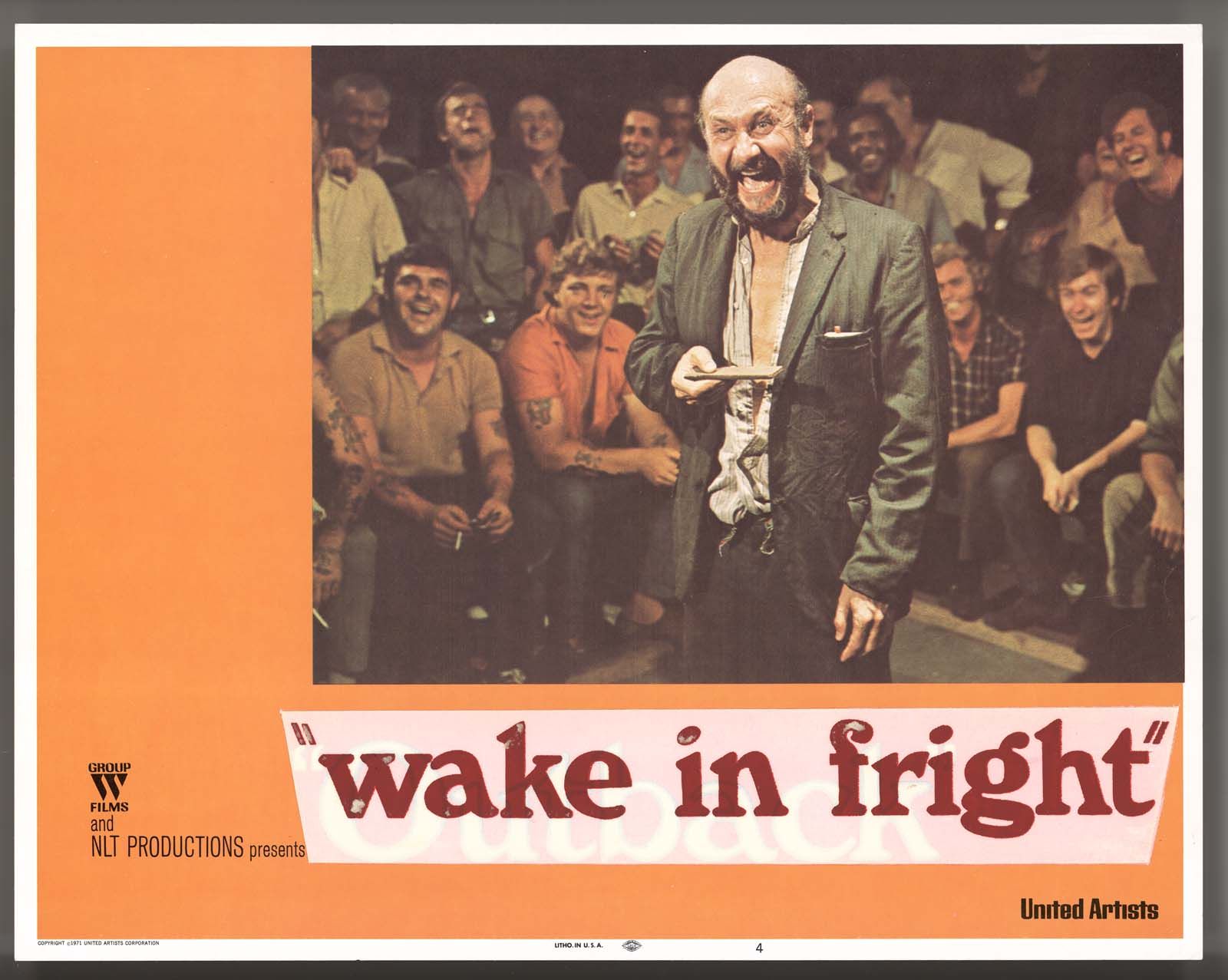 Note the Wake in Fright title appears to be covering the film's overseas title, Outback, suggesting this lobby card was also modified and used to publicise the film in other countries.