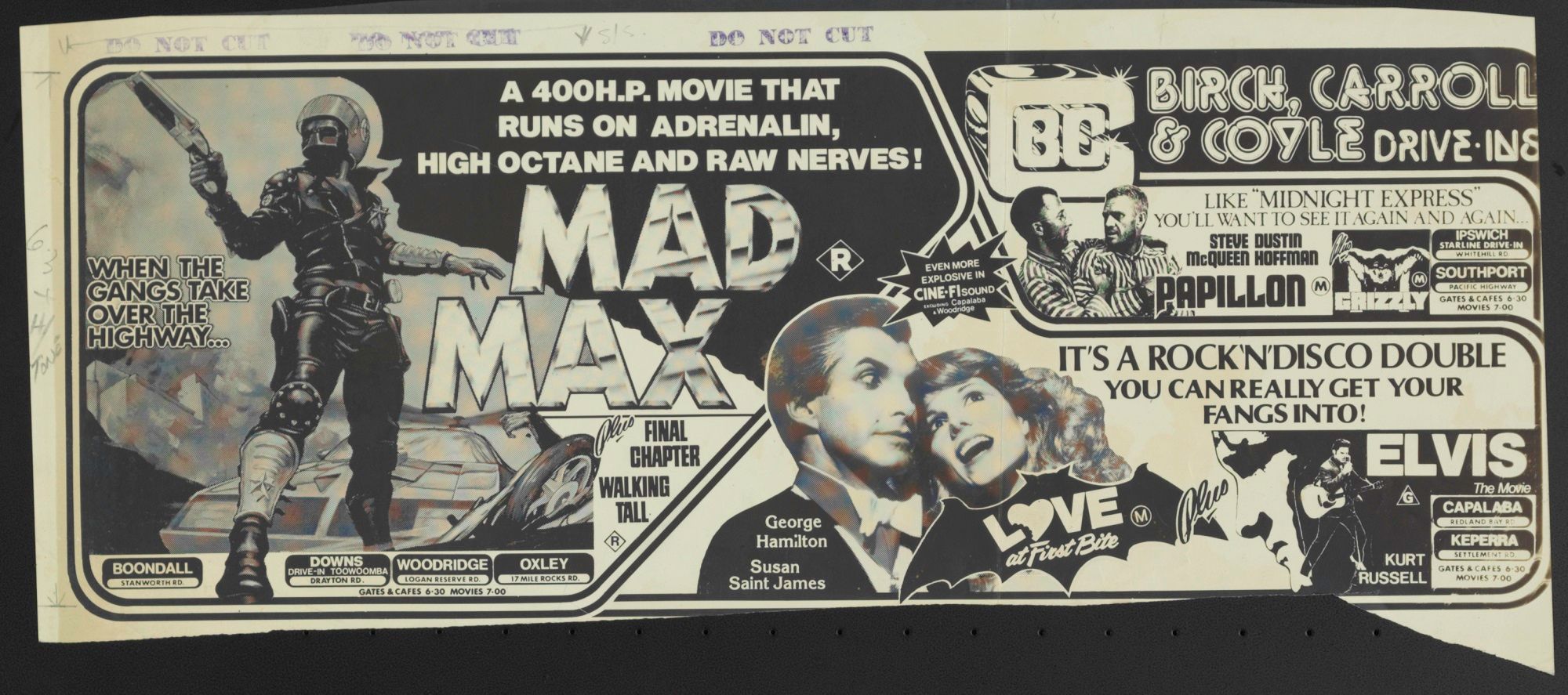 This is a layout for a newspaper advertisement for Mad Max screenings at Birch, Carroll and Coyle drive-in theatres.