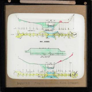 This slide shows two plans, two longitudinal sections and a cross-section of the main avenues, now known as Commonwealth Avenue and Kings Avenue, including the points where they cross over the lake.