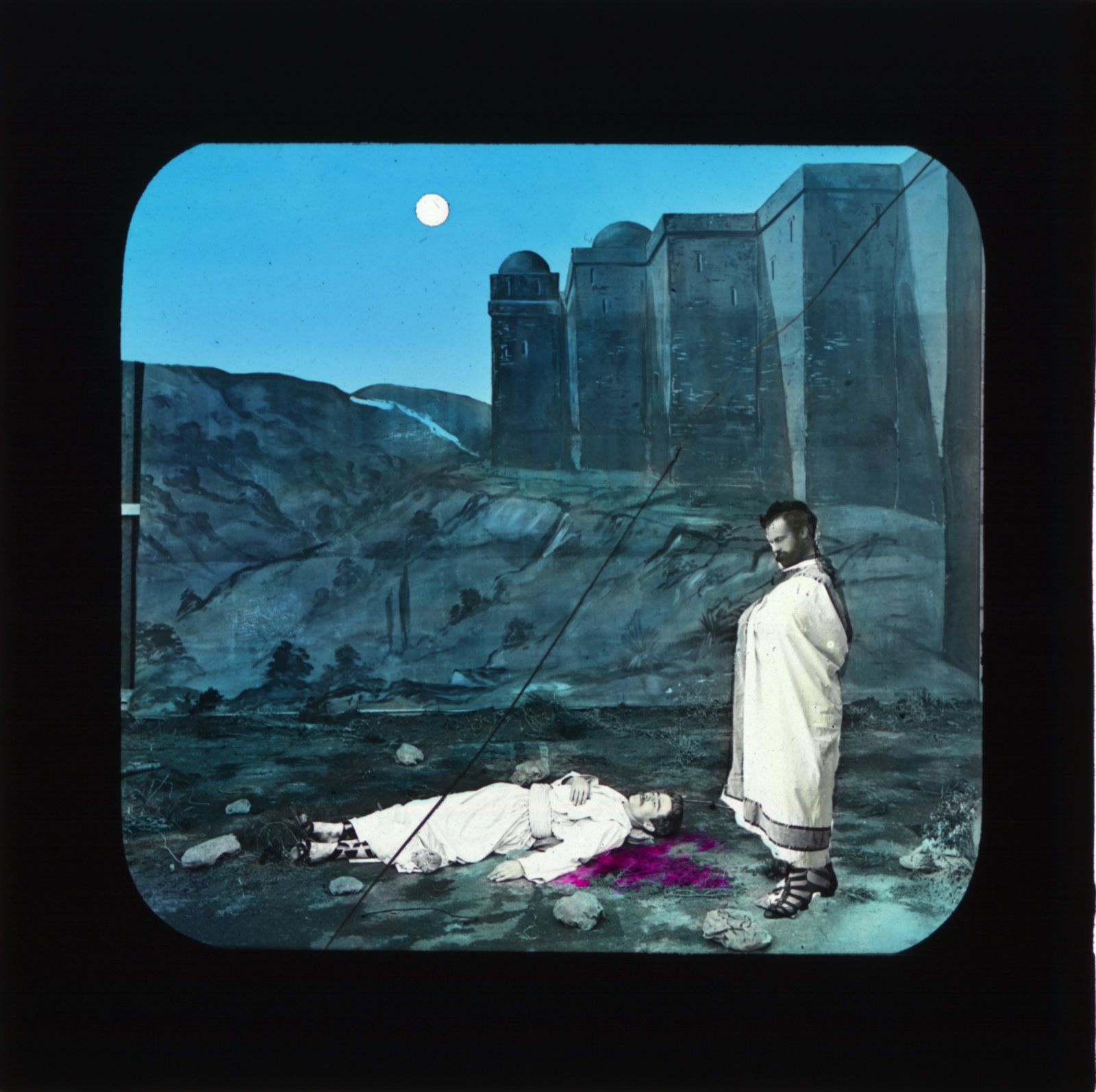 These glass slides are all that remain of the production, with no moving image or text copies of the narration known to survive. Combining narration, film footage, illustrations and music, Soldiers of the Cross was a forerunner to Australia’s first feature film.