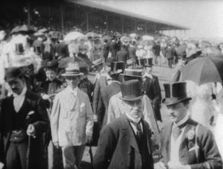 Never short of a good idea to entertain his audiences, Walter Barnett, the producer of this film, encourages the crowd to wave their hats as the horses come down the straight to the finish line.