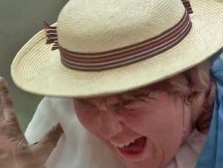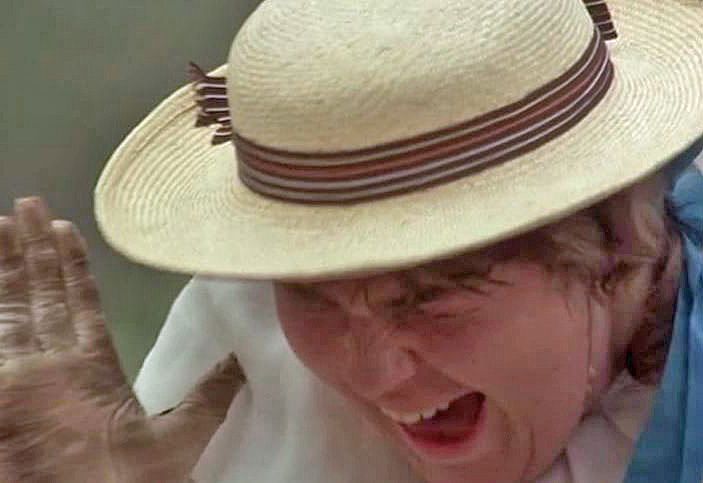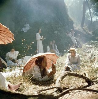 Miranda (Anne Lambert, centre, with magnifying glass) and other students at the picnic.