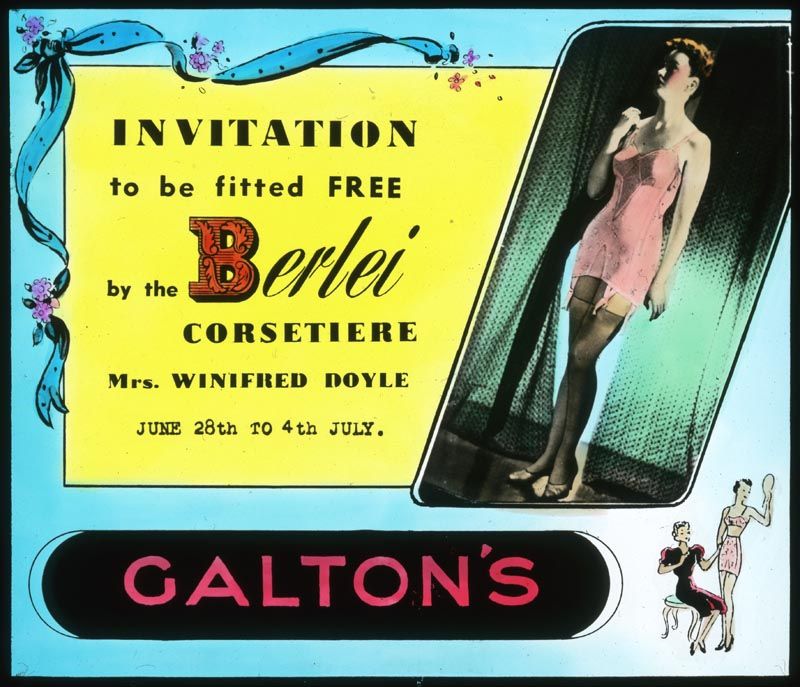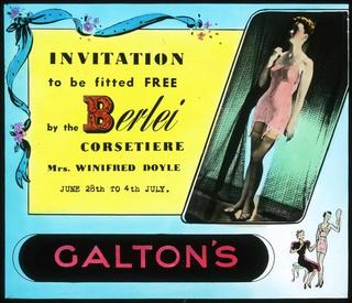 This cinema glass slide advertises the services of Berlei corsetiere Mrs Winifred Doyle. Galton's was a department store in Maitland, NSW. Mrs Doyle was based in Sydney but she travelled around New South Wales performing fittings during the late 1930s and early 1940s.
