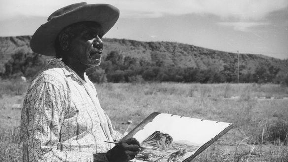 A short film showing Arrernte artist Albert Namatjira at work in the country that he knows so well. Raised at the Hermannsberg mission near Alice Springs, Namatjira was 30 years old before he first picked up a paintbrush in the mid-1930s. He had asked Rex Battarbee, a visiting landscape painter, for art supplies and guidance. Namatjira’s Western-style watercolour landscapes soon sold for high prices, and he became a household name, inspiring the Hermannsberg School of painting. Throughout Namatjira’s life, and despite his success, he remained in the bush with his people and his paints.
