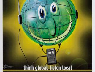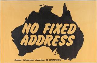 This striking poster for the band No Fixed Address features their name emblazoned across a map of the whole continent, symbolising solidarity with all First Nations Australians. It's a bold message of survival that also irreverently refutes the legal fiction of terra nullius (land belonging to no one) applying to Australia. 'No Fixed Address' resonates with broader experiences of displacement and marginalisation faced by Aboriginal and Torres Strait Islanders. The band later found it 'slightly ironic' when a laneway in Adelaide was named after them, giving them a 'permanent' address in the city.