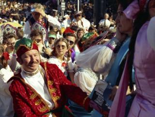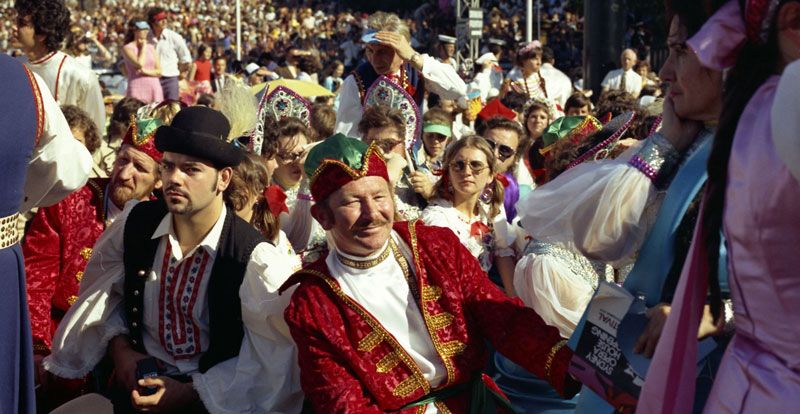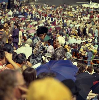 A crowd of people gather for the opening of the Sydney Opera House.