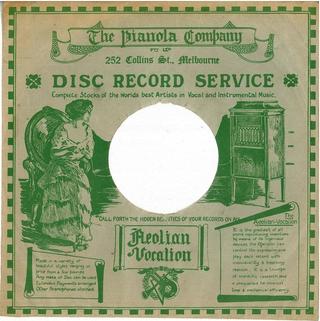 The Pianola Company, 252 Collins St, in Melbourne also sold the Aeolian Vocalion range of record players and had 'Complete Stocks of the Worlds Best Artists in Vocal and Instrumental Music’.