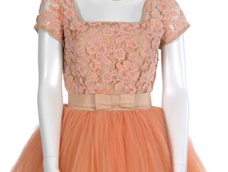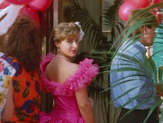The hot-pink bridesmaid’s dress is matched with pearl choker necklace, nylon lace gloves, white floral-and-pearl headpiece and pearl and gold clip-on earrings. The neckline is defined by a stiff ruffle of pink tulle with seed-pearl decoration and the bridesmaids all wear their hair in the same up-swept style. This is the group that Muriel desperately wants to join and part of her story is how these combative bridesmaids agree to accompany her down the aisle at her dream wedding.