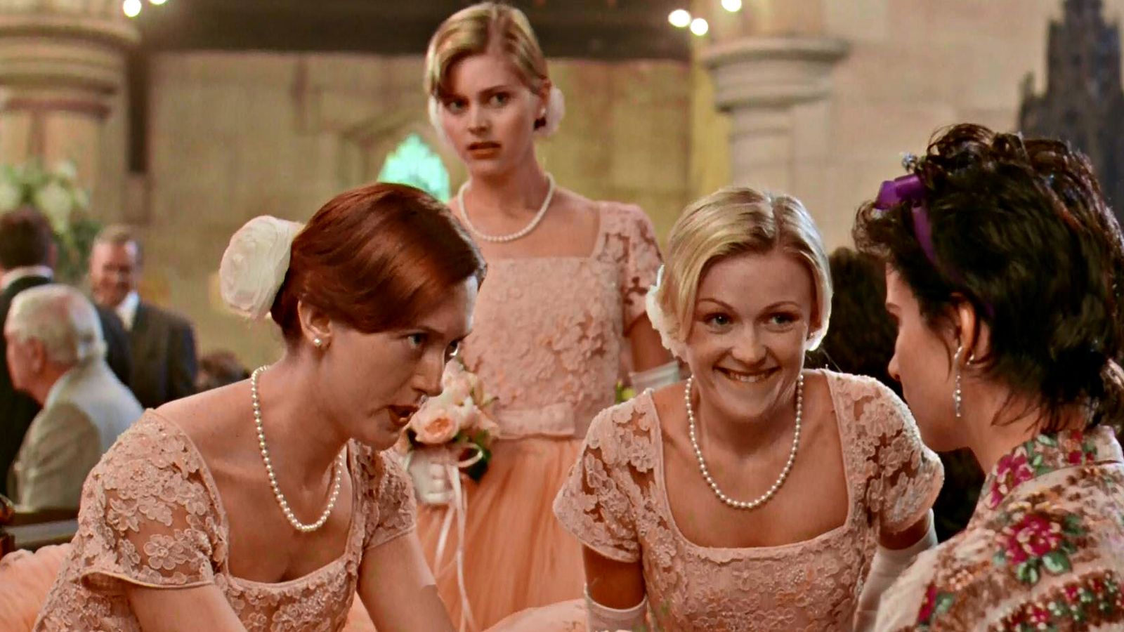 The pink bridesmaids’ ensembles were worn by Janine (Belinda Jarrett), Cheryl (Rosalind Hammond) and Nicole (Pippa Grandison) at Tania’s wedding at the start of the film.