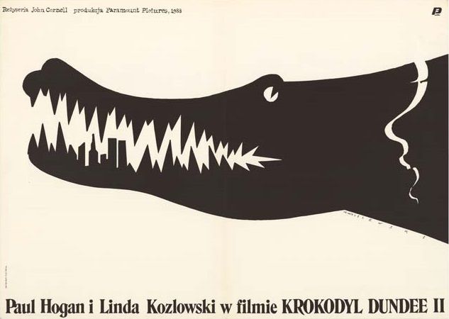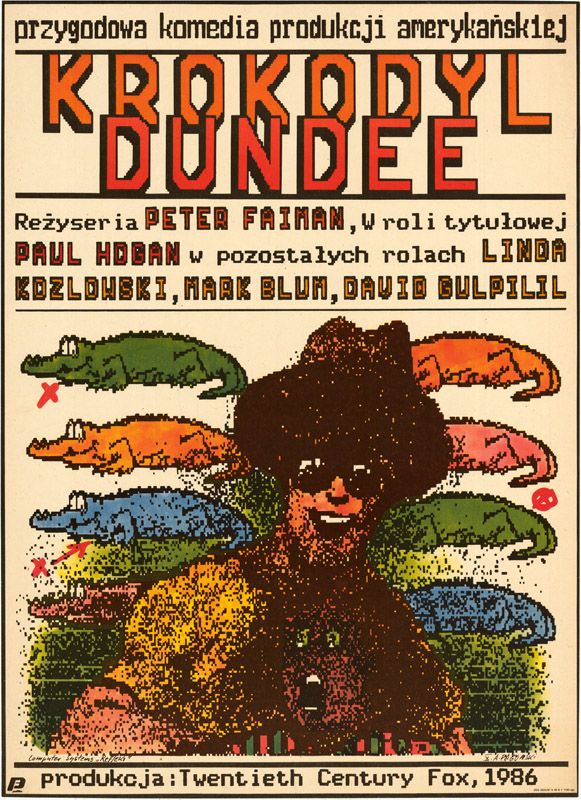 This Polish poster for Krokodyl Dundee II (Crocodile Dundee II) bears little resemblance to the Australian artwork featuring Paul Hogan (Mick Dundee) and Sue Charlton (Linda Kozlowski).
