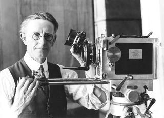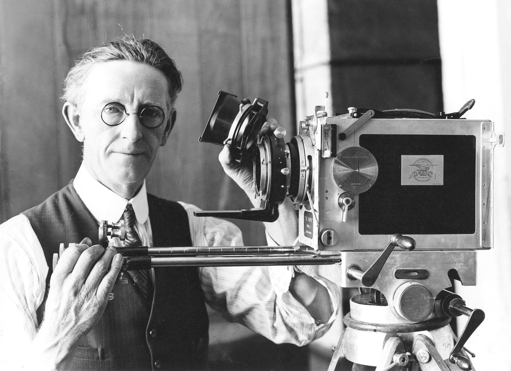 Portrait of Bert Ive with his Debrie camera