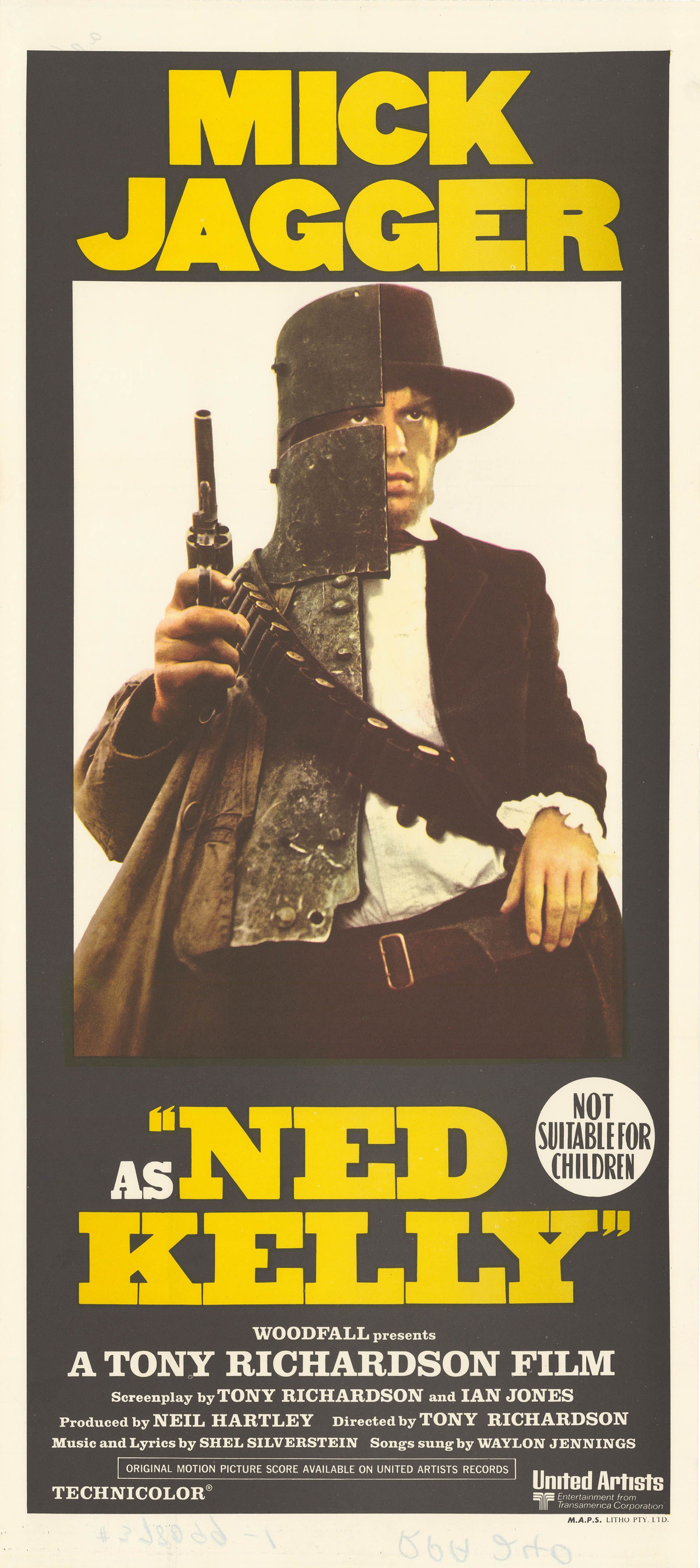 Film posters play an important role in the theatrical release of a movie. They are designed to hint at what a film is about while also highlighting promotional elements such as famous stars. This is evident in the daybill poster for the 1970 Ned Kelly movie, with pop singer Mick Jagger dominating the poster and his name appearing above the title. The Rolling Stones superstar playing the iconic bushranger was a huge drawcard for audiences – which is why the poster designer cleverly found a way to keep his face recognisable and include the iconic Kelly helmet.