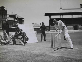 Production still of Sir Donald Bradman batting in front of a production crew on the set of The Flying Doctor (1936)