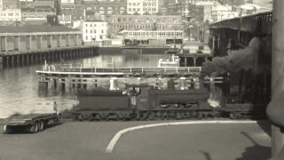 Still image from the documentary Steam on the Harbour: Darling Harbour's working trains. A documentary showcasing Darling Harbour as a busy railway goods yard, long before it became one of Sydney's main destinations for recreation and entertainment. It features footage shot by transport enthusiast and cinematographer Roger McKenzie and his friend Bernie Kent in the 1960s and 70s