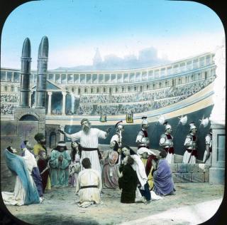Soldiers of the Cross was an illustrated lecture, combining photographic glass slides with short film segments and musical accompaniment, to relate the stories of Christ and the early Christian martyrs.
