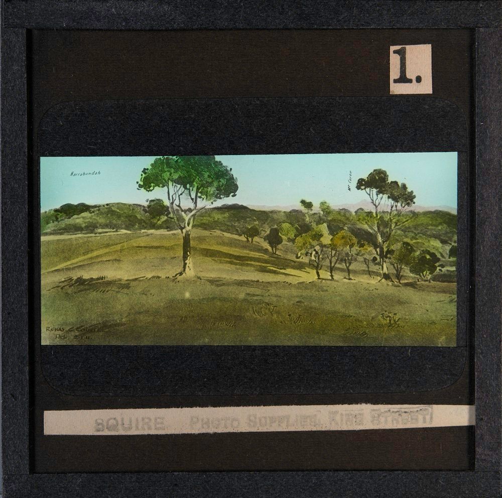 This slide shows one of six sections of the painting titled Cycloramic View of Canberra Capital Site, View Looking from Camp Hill, created by Robert Charles Coulter on 2 January 1911.